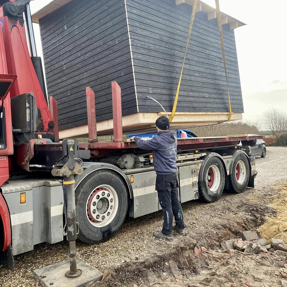 Her har vi bygget et saunahus. Huset er derefter blevet leveret og færdiggjort hos vores kunde i Bjerregaard.