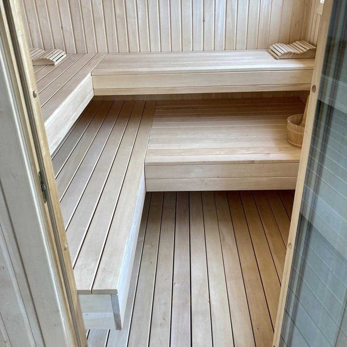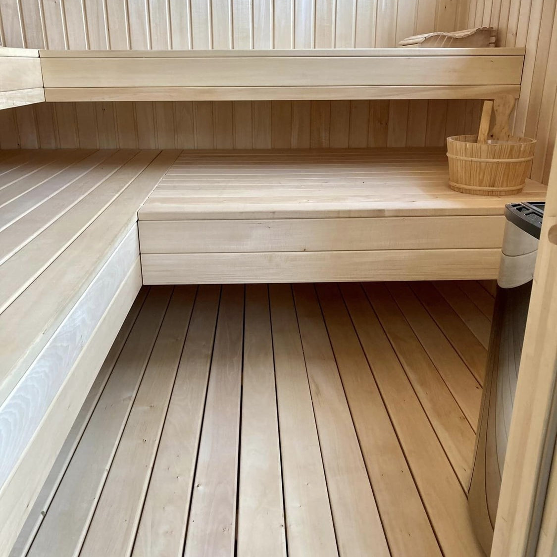 Indvendig beklædning, samt bænke er udført i aspetræ.